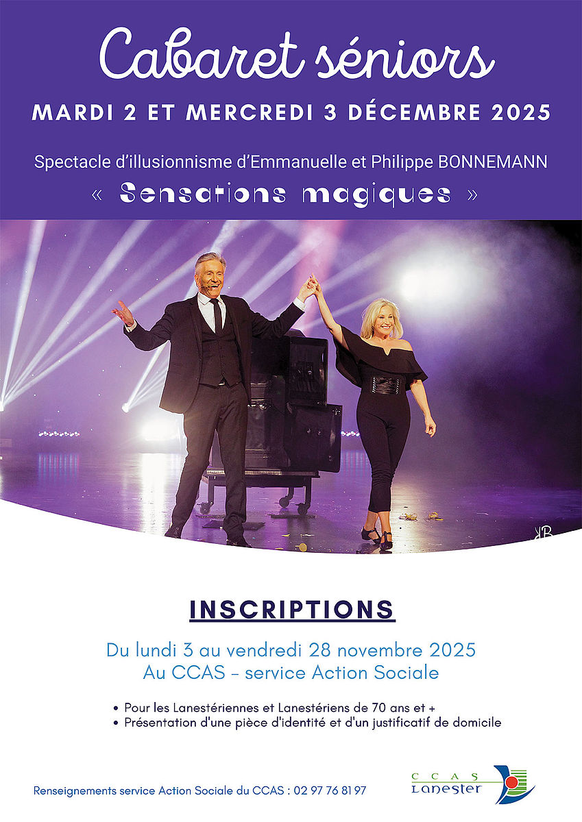 En décembre, c'est ambiance "Cabaret" pour les Lanestériennes et Lanestériens de plus de 70 ans ! Au programme dans la salle de spectacle QUAI 9 : spectacle d'illusionisme d'Emmanuelle et Philippe Bonnemann puis animation et goûter dansant par le groupe Ol songs composé de Olivier Le Mellec et Olivia Boutry.