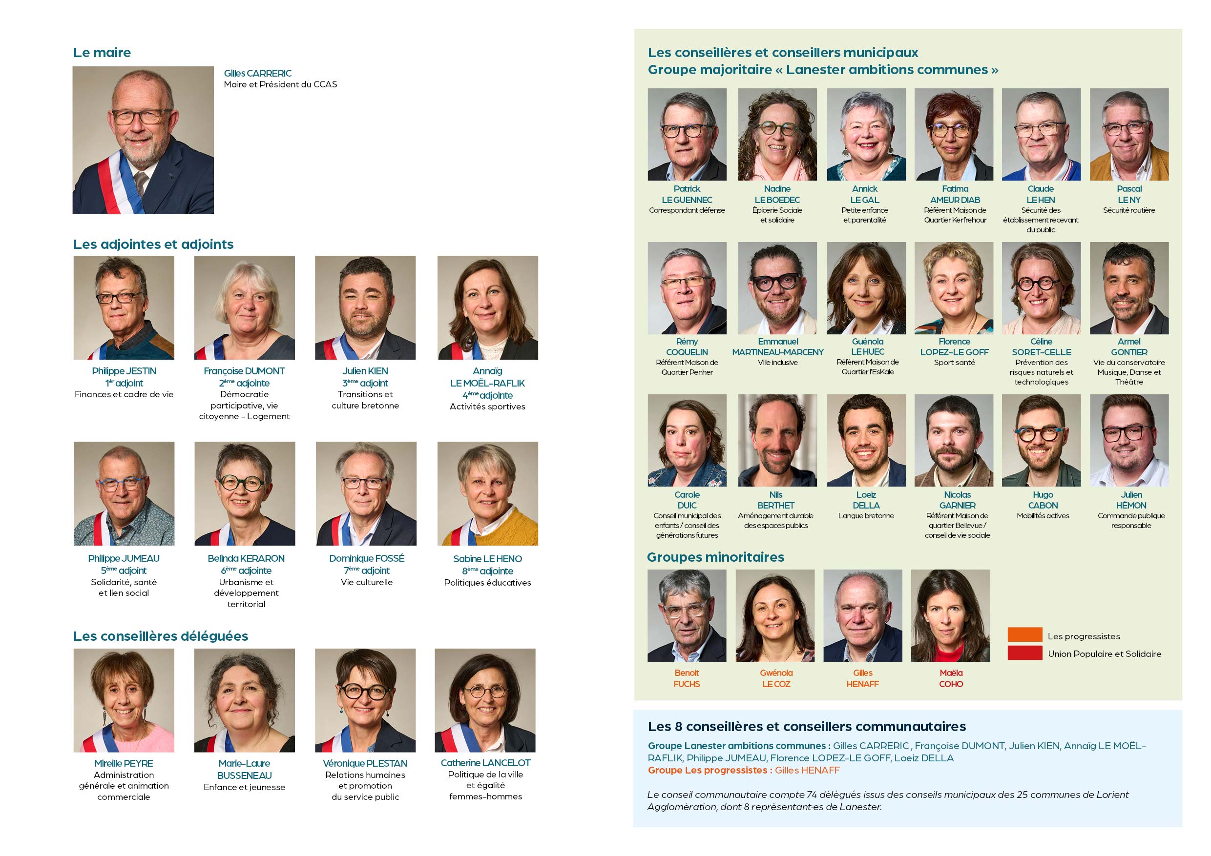 Le conseil communautaire compte 73 délégués issus des conseils municipaux des 25 communes de Lorient Agglomération , dont 8 représentants de Lanester.