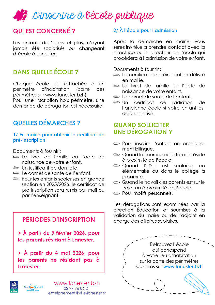 Renseignements : Service enseignement - 02 97 76 86 21 - enseignement@ville-lanester.fr