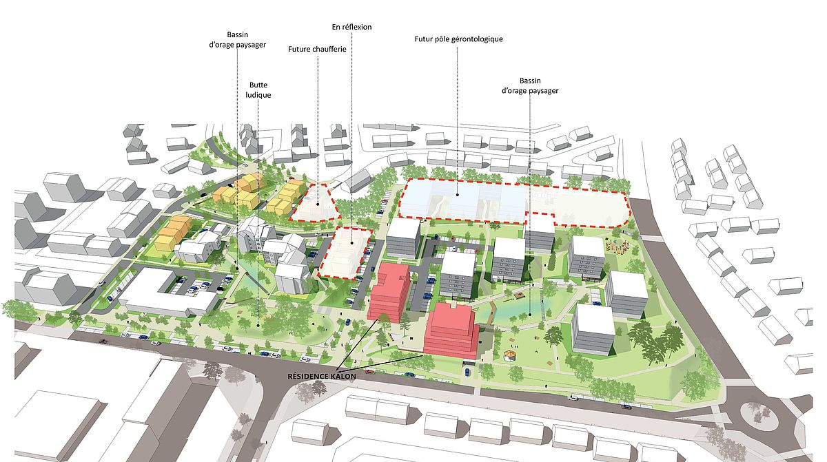 Plusieurs propriétés foncières sont présentes sur le secteur du quartier. Un transfert de foncier permettra de regrouper et d'intégrer les nouveaux projets : logements (100 logements démolis pour 80 à 100 logements créés), opération KALON (ex-Polunik, qui regroupe commerces, logements, maison de quartier et un espace "économie sociale et solidaire"), chaufferie bois et pôle gérontologique.