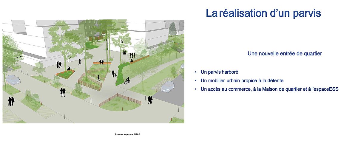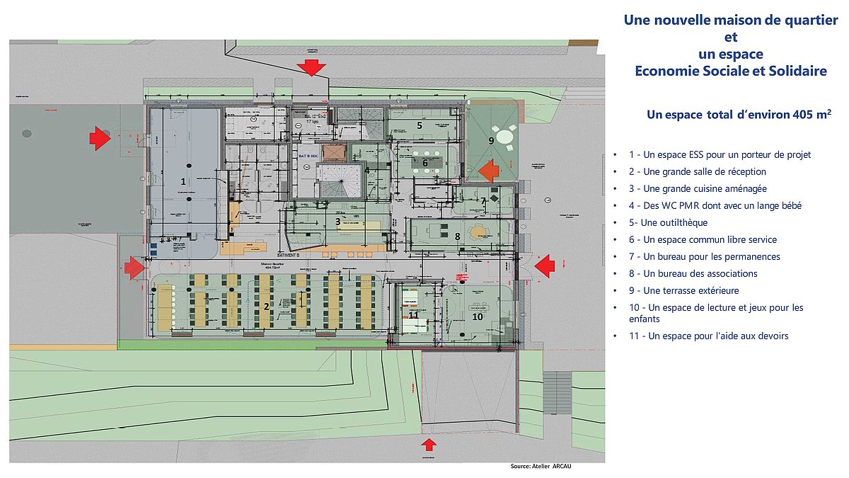Accueillante, elle sera la nouvelle porte d’entrée du quartier. L’accès se fera par le parvis à l’Ouest. Traversant, le bâtiment sera ouvert sur une terrasse et un espace vert, doté d’un kiosque ou d’un préau pour accueillir les animations de quartier chères aux habitants. L’équipement d'environ 340 m² sera doté d’une cuisine, de bureaux, de salles d’activités, d’un espace commun (outils, machine à laver, local stockage…). Attenant, un espace Economie Sociale et Solidaire (ESS) de 56 m2 fera prochainement l'objet d'un Appel à Manifestation d'Intérêt (AMI).